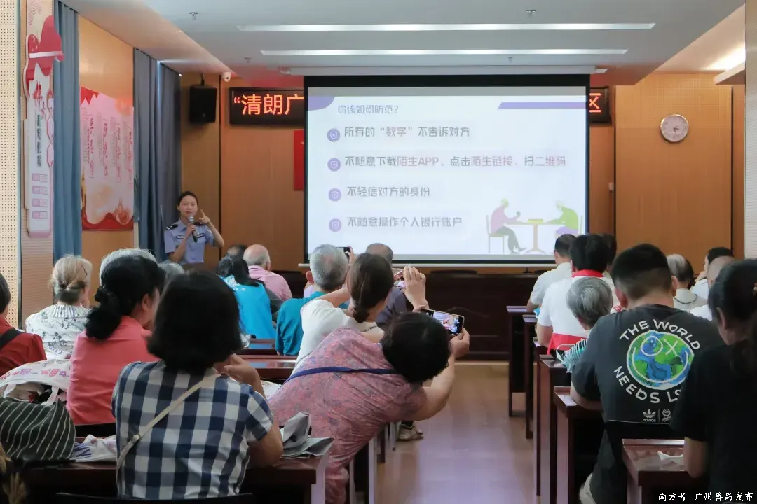 番禺区公安分局民警庞彦带来专题讲座,围绕网络防诈重要性、个人信息保护、密码安全、不良信息识别等网络安全常识进行科普。她结合典型案例,深入剖析了电信网络诈骗的常见类型、手法,并分享了实用的防范技巧,面对面解答居民疑问。